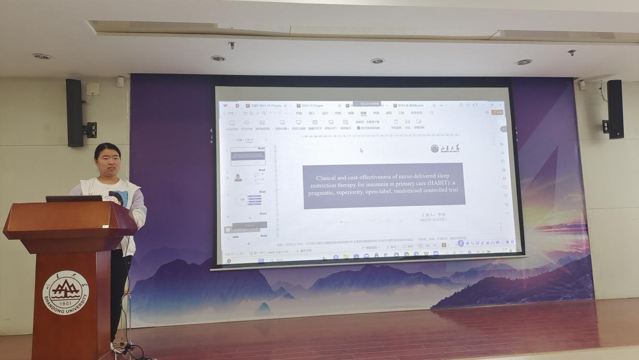 第三位汇报者是2022级硕士研究生李丽,汇报的文章来自于Lancet期刊,文献题目为“Clinical and cost-effectiveness of nurse-delivered sleep restriction therapy for insomnia in primary care (HABIT): a pragmatic, superiority, open-label, randomised controlled trial”。失眠症影响10%的成年人口,且会降低生活质量,增加罹患心理疾病、心血管疾病等风险,并增加相关经济花费。由于资源的不充足,只有1%的失眠症患者接受了首推的多组分认知行为疗法,更多患者通过服用药物进行治疗,有较多的副作用。本研究在英国的35个全科诊所实行了由初级卫生保健中的护士为失眠症患者提供睡眠限制疗法的干预试验,主要研究睡眠限制疗法对失眠症患者的失眠严重程度、健康相关生活质量和工作效率等的影响,以及计算睡眠限制疗法的成本效益。结果显示,由护士指导的睡眠限制疗法对失眠症患者的失眠症状有明显的效果,且显著改善了患者的抑郁程度、心理健康生活质量和工作效率。睡眠限制疗法也具有较高成本效益,有利于后续该疗法在初级卫生保健服务中进行推广,使更多的失眠症患者受益。