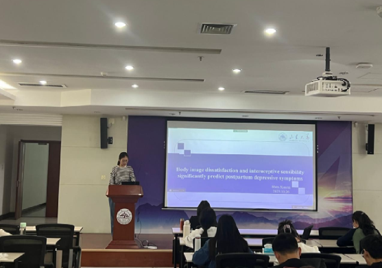 第二位汇报者是2022级硕士研究生申晓娜,汇报的文章来自于Journal of Affective Disorders期刊,题为Body image dissatisfaction and interoceptive sensibility significantly predict postpartum depressive symptoms。在怀孕期间,女性的体重、体型和身材会在相对较短时间内发生迅速而独特的变化,但怀孕也会涉及多个内部身体区域的内部感受。而目前研究的重点是在怀孕期间外部身体形象变化的作用,缺乏对身体内部变化的研究。因此,本研究开展了一项3期的纵向研究,招募了健康的孕妇,通过测量孕中期、孕晚期和产后六周的身体形象满意度、内感受敏感性和抑郁症状得分,来评估身体形象不满和内感受性在孕期和产后的变化及其是否以及如何对产后抑郁症状产生影响的。结果发现围生期抑郁症状保持稳定,但产后对身体形象的不满情绪增加,内感受性孕期高于妊娠期,身体形象的不满和较低的内感受性是产后抑郁症状的独立危险因素。本研究通过一个纵向研究支持了身体形象不满和内感受在产后抑郁症状发展中的重要性。未来的研究需要调查旨在增加内感受性措施是否有助于预防抑郁症状以及识别这些变化的生物机制。