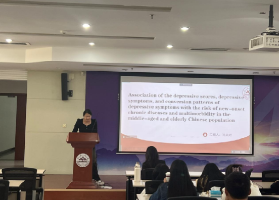 第三位汇报者是2022级硕士研究生孙凤叶,汇报的文章为来自于eClinicalMedicine期刊,题为“Association of the depressive scores, depressive symptoms, and conversion patterns of depressive symptoms with the risk of new-onset chronic diseases and multimorbidity in the middle-aged and elderly Chinese population”。本研究旨在分析抑郁得分、医院症状、抑郁症状转换模式对新发慢病及共病的风险。本研究使用来自The China Health and Retirement Longitudinal Study(CHARLS)队列,纳入了2011年、2013年、2015年、2018年四年的数据,把2013年的数据作为基线,根据2011-2013年的抑郁评分把抑郁症状转换分为一直不抑郁、新发的抑郁、缓解的抑郁、持续的抑郁四组。探究了2013年抑郁得分、2013年抑郁症状、2011-2013年抑郁转换模式对12种常见慢病及共病发病率的影响。本研究的结果显示(1)抑郁评分是心脏病、中风、糖尿病(DM)/高血糖(Hglu)、消化系统疾病、肝脏疾病、肾脏疾病、肺部疾病、记忆疾病和多病的独立新发危险因素。(2)抑郁症状是心脏病、DM/Hglu、消化系统疾病)、肾脏疾病、肺部疾病,记忆疾病和多病的独立新发危险因素。特别是,其是癌症的重要保护因素。(3)新发现的抑郁症状是4种慢性疾病的独立危险因素:心脏病、消化系统疾病、肺部疾病和多病。抑郁症状缓解也是4种慢性疾病的独立危险因素:DM/Hglu 、肝脏疾病、肺部疾病、多病。持续性退行性痴呆与8种慢性疾病的新发风险较高相关,除了高血压、中风、肝病、哮喘和风湿病。特别是,缓解的抑郁症状和持续的抑郁症状都都是癌症的显著保护因素。