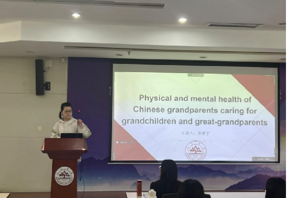 第一位汇报者是2022级硕士研究生彭馨宁,汇报的文章为来自于Social Science and Medicine期刊,题为“Physical and mental health of Chinese grandparents caring for grandchildren and great-grandparents”。本研究旨在分析照顾对中国祖父母健康的影响,以及这种影响是否会因他们城乡和性别的不同而有所差异。本研究使用来自中国健康与退休纵向研究(CHARLS)2011年基线调查和2013年后续调查的数据,具有全国代表性;纳入了基线时至少有一位曾祖父母和一位十六岁以下孙辈在世的祖父母,同时分析了照顾孙辈和/或曾祖父母对他们健康的影响,补充了先前研究只研究照顾孙辈或者曾祖父母对健康的影响的不足;同时评估了祖父母的心理健康和身体健康,心理健康通过生活满意度和抑郁症状水平进行评估,身体健康通过高血压、静息高危脉搏、糖尿病和急慢性炎症患病率进行评估;根据城乡和性别的不同将祖父母分为城市祖父、农村祖父、城市祖母和农村祖母四组,分析了城乡和性别对结果的影响。本研究的结果显示,与非照顾者相比,只照顾孙辈的祖父母以及同时照顾孙辈和曾祖父母的“三明治”祖父母的身心健康状况都更好,并且这种健康效益在城市祖父身上最为明显。不过本研究对于照顾的分组比较粗糙,也没有考虑到具体照顾人数的影响,使用的2013年的数据也缺少一部分指标无法与2011年进行比较。