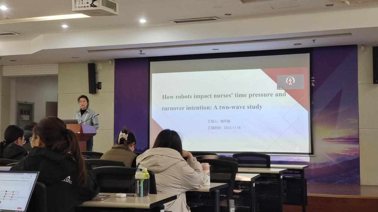 第一位汇报者是2022级硕士研究生程环毓,汇报的文章是“How robots impact nurses' time pressure and turnover intention: A two-wave study”。该研究聚焦护士群体,研究当下热点的机器人AI对护士群体的影响,具体研究了努力确保机器人的平稳运行、时间压力、护理缺失及离职意愿之间的关系,以及机器人的表现如何能够调节手术室内努力确保机器人的平稳运行对时间压力及护理缺失的影响。首先提出并检验努力确保机器人的平稳运行对护理工作场所结果的影响。研究发现,努力确保机器人的平稳运行与时间压力、离职意愿呈正相关。这一发现为机器人设计的改进提供了一条新的途径,有助于降低护士的离职倾向,机器人可以减轻时间压力和避免护理缺失。同时机器人不会占用护士的时间和精力,却可以腾出更多的时间给护士照顾病人。因此,对于研发人员来说,可以把目标放在如何研发出更多适合护理人员的机器人,医院的管理人员可以考虑引入适合护士群体的机器人,使护理水平不断上升,进而造福社会。