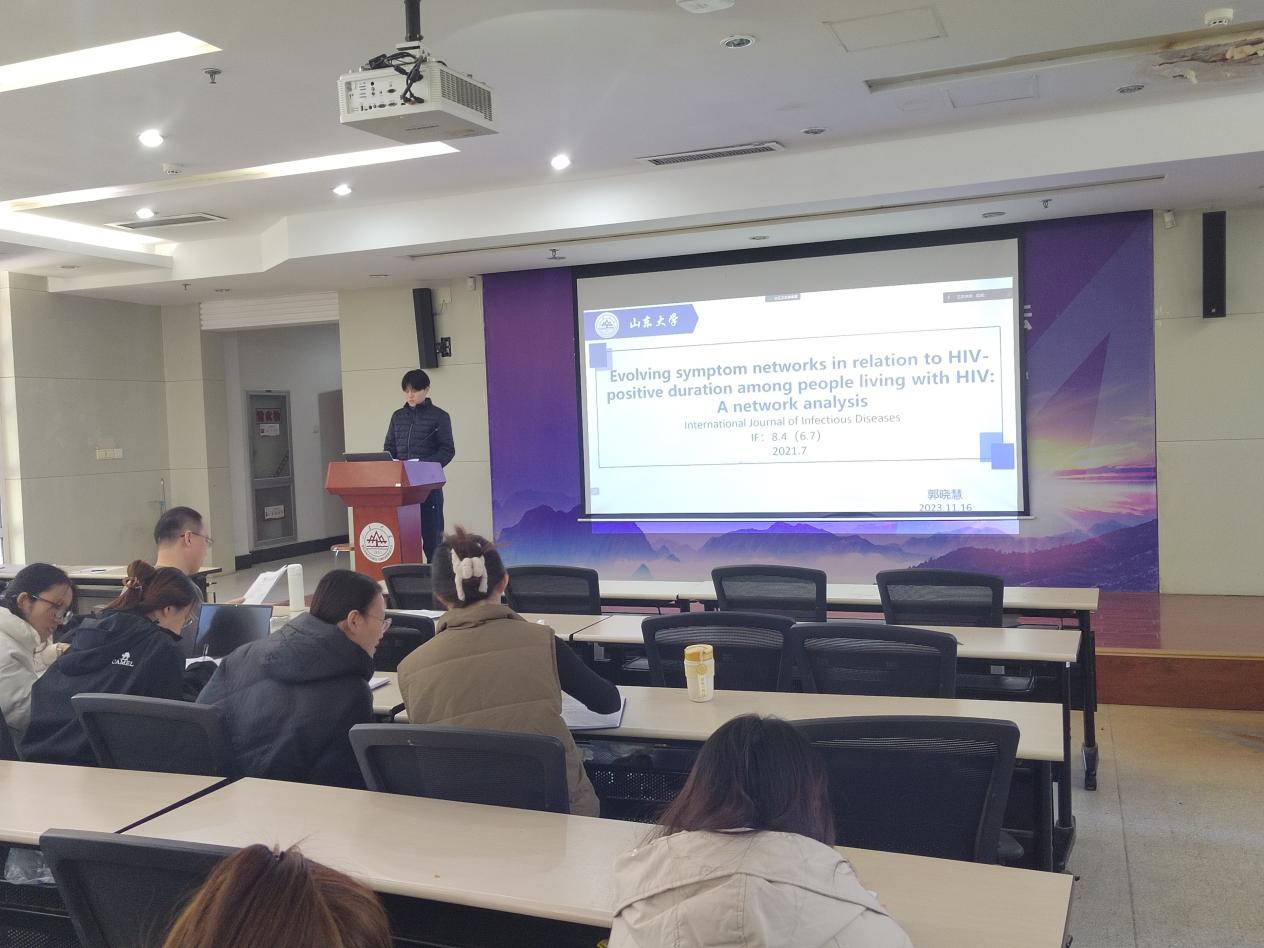 第四位汇报者是2022级硕士研究生郭晓慧,汇报的文章来自International Journal of Infectious Diseases杂志,题为“Evolving symptom networks in relation to HIV-positive duration among people living with HIV: A network analysis”。这篇文献对中国艾滋病相关症状监测调查的数据进行了二次分析,构建了 27 种症状之间的症状网络,并比较了不同HIV阳性持续时间的人群中症状网络的中心性指数和密度。研究结果表明,HIV阳性持续时间较长的PLWH并没有更严重的症状;相反,他们的症状网络比新确诊的HIV感染者更密集。疲劳是HIV阳性持续时间小于10年的PLWH最严重和最主要的症状。在HIV阳性持续时间大于10年的PLWH中,意识模糊是3个中心指数中最主要的症状。本研究表明,有必要将PLWH症状网络评估作为HIV护理的重要组成部分。本研究采用了症状网络分析的方法,对不同HIV阳性持续时间的PLWH构建了症状网络,考虑到了时间对症状的影响,并识别了核心症状,很有临床意义。症状网络可以纳入更多的症状来分析它们之间的复杂关系,值得借鉴。