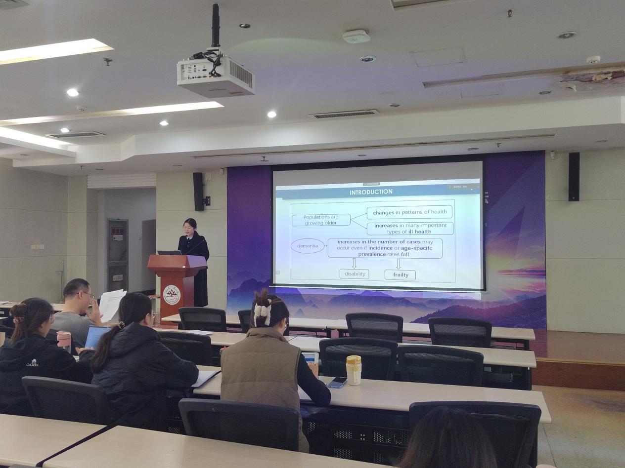 第三位汇报者是2022级硕士研究生任晓贺,汇报的文献题目是“Relationship of body mass index with frailty and all-cause mortality among middle-aged and older adults”,这篇文章于2022年10月发表于《BMC Medicine》(IF = 10.4, JCR = Q1)期刊。随着老龄化和肥胖人口的增长,代谢性疾病的患病率也在上升。身体质量指数(BMI)与衰弱程度和死亡率之间的关系是有争议的。本篇文章研究了高BMI与虚弱和死亡率的关系,并探讨了体脂百分比对这些关系的影响。该研究使用两个公共数据库对问题进行探究,采用普通最小二乘(OLS)回归分析探究BMI和衰弱之间的关系,采用按FI水平分层的Cox回归模型评估BMI较高的死亡风险,体脂百分比在BMI与衰弱之间的中介作用采用Andrew F.Hayes的单中介回归模型检验,在BMI与死亡风险之间的中介作用采用MacKinnon的系数乘积法检验。在这项研究中,我们发现超重是中度/重度衰弱人群死亡率的保护因素,而1级肥胖可能对至少轻度衰弱人群的死亡率有保护作用。相反,2级和3级肥胖可能与非衰弱人群较高的死亡风险有关。BMI和身体衰弱之间的关系部分可以用身体脂肪来解释。该结果对中老年人衰弱患者体重控制与否以及肥胖悖论和衰弱之间的关系的明确提供了一定的理论依据。