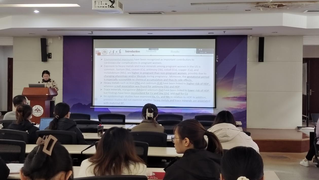 第二位汇报者是2022级硕士生程爽,汇报的文章来源于EI(Environment International),环境方面优秀期刊,1区,影响因子为12.41,题目为《Exposure to heavy metals and trace minerals in first trimester and maternal blood pressure change over gestation》妊娠期高血压疾病(HDP)是孕妇最常见的心血管并发症之一。无论是哪种HDP,怀孕期间血压升高都会增加不良妊娠结局的风险,包括流产和早产,并会对母亲及子代有心血管疾病长期影响。此外,血压在妊娠期间还会不断变化。20 周前(即早孕期)血压升高和整个孕期血压变化模式都与不良的围产期和子代结局有关因此,确定潜在可改变的风险因素至关重要,环境暴露已被认为是孕妇心血管并发症的重要危险因素。妊娠期特别容易受到化学物质积累的影响,从而产生副作用。该研究旨在通过使用贝叶斯核机器回归(BKMR)来评估化学混合物暴露与BP和HDP的相关性,这是一种来研究各种化学品复杂共同暴露的新颖非参数方法。与传统的线性或Logistic回归相比,BKMR不依赖于假设,并且具有揭示多个曝光的潜在共线性、非线性和交互关系的优点。