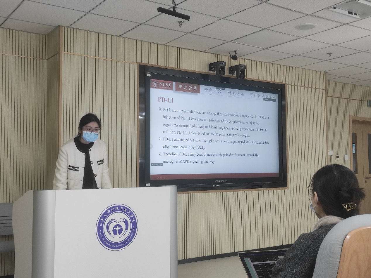 第一位汇报者是2022级硕士研究生李金潞,汇报的文章来自于International Immunopharmacology,题为Electroacupuncture alleviates neuropathic pain caused by SNL by promoting M2 microglia polarization through PD-L1。神经性疼痛作为一种常见的临床疾病,很难用药物治愈;疼痛的发生和进展与脊髓小胶质细胞的反应密切相关;PD-L1在调节小胶质细胞活性方面起着关键作用,PD-L1的缺失促进了M1样小胶质细胞的极化,PD-L1表达增加促进M2样极化。电针在临床上具有显著的镇痛作用,但其具体作用机制仍有待进一步探讨。在这项研究中,研究者通过脊髓神经结扎(SNL)验证了PD-L1在大鼠和脂多糖(LPS)处理的BV2小胶质细胞中EA镇痛中的作用和潜在的分子机制。在大鼠的行为研究中,测量了机械戒断阈值(MWT)和热戒断潜伏期(TWL),并在透射电子显微镜下检查脊髓神经,以确定其髓鞘结构的变化。采用酶联免疫吸附法、流式细胞术、免疫荧光染色法和Western blot法检测大鼠脊髓和BV2小胶质细胞中PD-L1和M1/M2特异性标志物的表达水平。综上所述,研究结果表明,EA可能通过PD-L1调节原代传入神经元的兴奋性,进而抑制MAPK信号通路,促进活化的M1小胶质细胞转化为M2小胶质细胞,减少炎症反应,最终达到镇痛作用,靶向PD-L1的治疗可能是治疗神经性疼痛的有效策略。