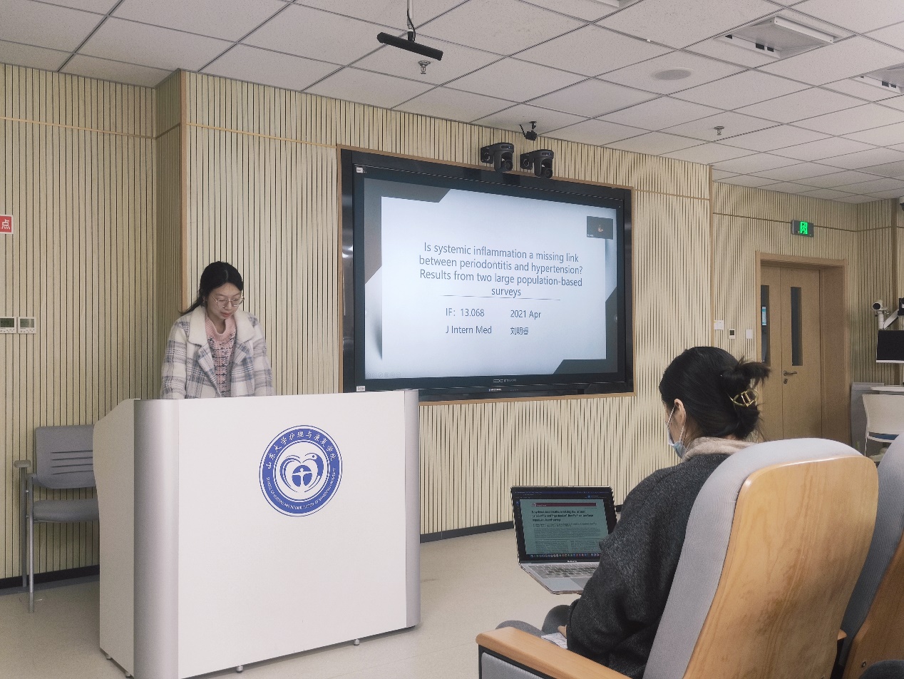 第四位汇报者是2022级硕士研究生刘明睿,汇报的文章为来自于Journal of Internal Medicine期刊,题为 “Is systemic inflammation a missing link between periodontitis and hypertension? Results from two large population-based surveys”。这项研究利用两个大型数据库——美国国民营养健康(NHANES)及韩国国民营养健康(KNHANES)的数据,研究了牙周炎与高血压之间的关系以及全身炎症是否在关联中具有介导作用。结果表明,牙周炎与高血压密切相关,全身炎症部分是这种关联的介质。文中将牙周炎、系统性炎症指标及高血压分别按照分类变量和连续变量进行分析。在统计学思路上,在进行是否患牙周炎的简单差异性分析后,进行多因素logistic 回归分析及多因素线性回归分析,最后通过结构方程模型分析炎症标志物在牙周炎和高血压间的中介关系。该研究通过寻找共同影响因素将两种疾病相关联,并使用了两个数据库进行对比分析。