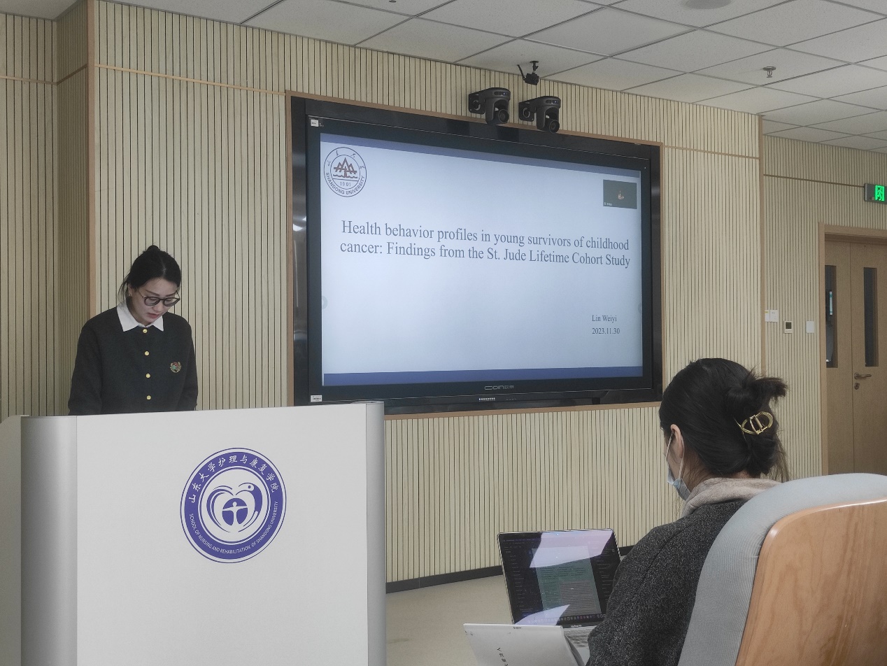 第三位汇报者是2022级硕士研究生林炜漪,汇报的文章来自于Cancer期刊,题为“Health behavior profiles in young survivors of childhood cancer: Findings from the St. Jude Lifetime Cohort Study”。儿童癌症幸存者(CCS)面临与癌症和治疗相关的有害健康结果的风险。参与健康生活方式行为有助于减少成年后的健康风险,但目前对于年轻CCS的健康生活方式行为(即身体活动、久坐/屏幕时间、饮食)与心脏代谢健康危险因素、体能表现和情绪健康之间的关联知之甚少。该研究旨在推导出年轻CCS人群的健康生活方式行为特征,以及检查人口统计学、诊断和/或治疗暴露、心脏代谢、体能表现和情绪功能与健康生活方式行为特征之间的关联。参与者包括来自圣裘德终身队列研究的397名CCS,他们完成了相应的健康调查。该研究主要采用潜在剖面分析法推导出CCS的健康生活方式行为特征。拟合出的2类模型将参与者分成了两组,分别是不活跃-不健康饮食(IU)组和活跃-久坐-不健康饮食(ASU)组。与ASU组的参与者相比,由更多成员组成的IU组的参与者表现出更高的静息心率和较低的运动能力评分。此外,研究发现CCS对多种健康行为指南的依从性较低,其行为特征与心脏代谢健康(即静息心率)和体能表现存在不同关联,且并没有观察到对所有健康变量的有力保护。该研究启示我们需要关注CCS的健康生活方式行为,并且筛查和干预措施应针对多种行为特征进行设计 。