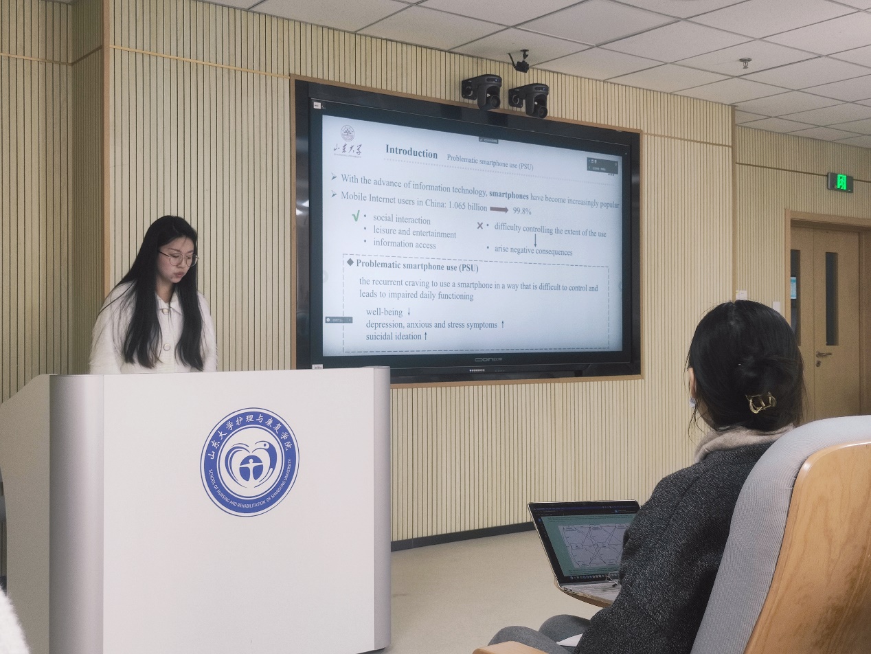 第二位汇报者是2022级硕士研究生李僖淼,汇报的文章来自于SLEEP MEDICINE期刊,题为“Bidirectional relations between problematic smartphone use and bedtime procrastination among Chinese university students: Self-control as a mediator”。文章采用纵向研究设计,分三个阶段进行数据收集,每个阶段间隔6个月,使用交叉滞后分析探讨了大学生问题性智能手机使用与睡眠拖延之间的双向关联,并揭示了自我控制的纵向中介作用。即,问题性智能手机使用能够正向预测睡眠拖延、睡眠拖延能够正向预测问题性智能手机使用、自我控制在问题性智能手机使用对睡眠拖延的影响中发挥纵向中介作用、自我控制在睡眠拖延对问题性智能手机使用的影响中发挥纵向中介作用。该研究选题贴合学生群体的生活现状,具有一定的实际研究意义,给教育工作者和临床心理学家为学生实施针对性干预提供了见解。此外,该文章逻辑论述清晰,较充分的说明了各变量之间的关系及所要研究路径的依据,值得学习与借鉴。