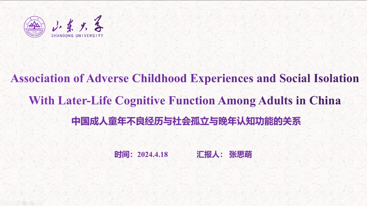 第二位汇报者是2022级硕士研究生张思萌,汇报的文章来自于JAMA NETWORK OPEN期刊,题目为“Association of Adverse Childhood Experiences and Social Isolation With Later-Life Cognitive Function Among Adults in China”。该研究旨在探讨与威胁相关和与剥夺相关的童年不良经历与中国中老年人认知功能下降的关系,同时评估社会孤立的调节作用。研究采用了中国健康与退休纵向研究(CHARLS)的数据,包括6466名参与者。研究使用了具有完整案例方法的线性混合效应模型,评估了威胁相关和剥夺相关童年不良经历与认知功能随时间下降的关联。模型中增加了童年不良经历与随访时间(年)的交互作用项,以评估童年不良经历与认知功能年下降率之间的关联。此外,当观察到显著关联时,进一步进行二次分析,使用三项交互检验评估基线的社会孤立在童年不良经历与认知功能下降之间的调节作用。结果显示,随着与剥夺相关的童年不良经历数量的增加,参与者随访期间认知评分的变化更突出。具体来说,与威胁相关的童年不良经历与基线时的整体认知、情景记忆、执行功能以及认知功能年下降率无关。而与未经历童年剥夺相比,经历1种与剥夺相关的童年不良经历的参与者在初始模型中整体认知、情景记忆和执行功能下降更快。与此同时,社会孤立被证明是童年剥夺、整体认知和执行功能年下降率较快的重要因素。在中国中老年人中,暴露于与剥夺相关的童年不良经历与认知功能年下降率增加独立相关。相比之下,没有发现与威胁相关的童年不良经历与认知功能下降有任何关联。此外,社会孤立可以调节与剥夺相关的童年不良经历与整体认知和执行功能下降的关联,这对后续干预有着重要意义。