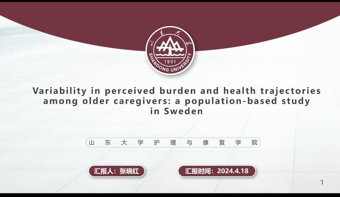 第三位汇报者是2022级硕士研究生张晓红,汇报的文章为来自于Journal of Epidemiology And Community Health期刊,题为 “Variability in perceived burden and health trajectories among older caregivers: a population-based study in Sweden”。该研究旨在确定经历最严重主观生活受限制的老年非正式护理员亚组,并为其中感知负担和客观健康状况下降最快、影响最大的亚组提供积极的针对性干预。本研究的非正式护理的负面影响是由护理者和被护理者双方的特征和护理环境决定的。结果显示,具有双重角色(接受照顾同时也需要去照顾其他家庭成员)、与配偶同居、每月照顾时长≥30h、年长、女性和受教育水平越高的照顾者会经历更大的主观生活受限制和感知负担。此外,客观的健康状况水平下降与照顾者的双重角色有关,这其中还受到社会人口学(如性别和社会网络)的调节。这篇文章证实了主观测量在不同照顾者亚群中预测客观影响的可靠性,也为我们临床护理科研工作提供了新的证据支持,即主观测量既是切实可行的方法,也是对客观结局指标具有指示意义的测量方法。