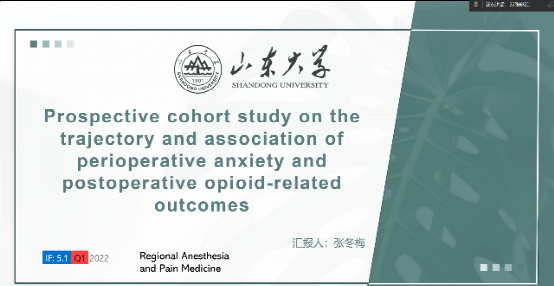 第一位汇报者是2022级硕士研究生张冬梅,汇报的文章为来自于Regional Anesthesia and Pain Medicine期刊,题为 “Prospective cohort study on the trajectory and association of perioperative anxiety and postoperative opioid-related outcomes”。大量研究表明,患者在围手术期使用阿片类药物可能造成相关危害,包括依赖和过量服用。目前尚不确定焦虑是否作为术后阿片类药物使用的独立危险因素或作为手术部位疼痛因果通路的中介。本研究对1771名接受择期外科手术的患者进行了一项前瞻性队列研究。记录患者手术当天、术后1个月、3个月和6个月的阿片类药物使用、疼痛和焦虑。经过协变量调整的混合效应回归模型验证了手术部位疼痛和焦虑背景下患者术后阿片类药物使用情况。结果发现,手术当天焦虑和手术部位疼痛的患者术后阿片类药物使用率更高。焦虑在疼痛对阿片类药物使用的关系中没有显著的中介作用。此外,焦虑是手术后疼痛增加和阿片类药物使用的独立危险因素。未来可采用靶向行为疗法以减轻围手术期的焦虑,这可能会对术后疼痛和阿片类药物的使用产生积极影响。