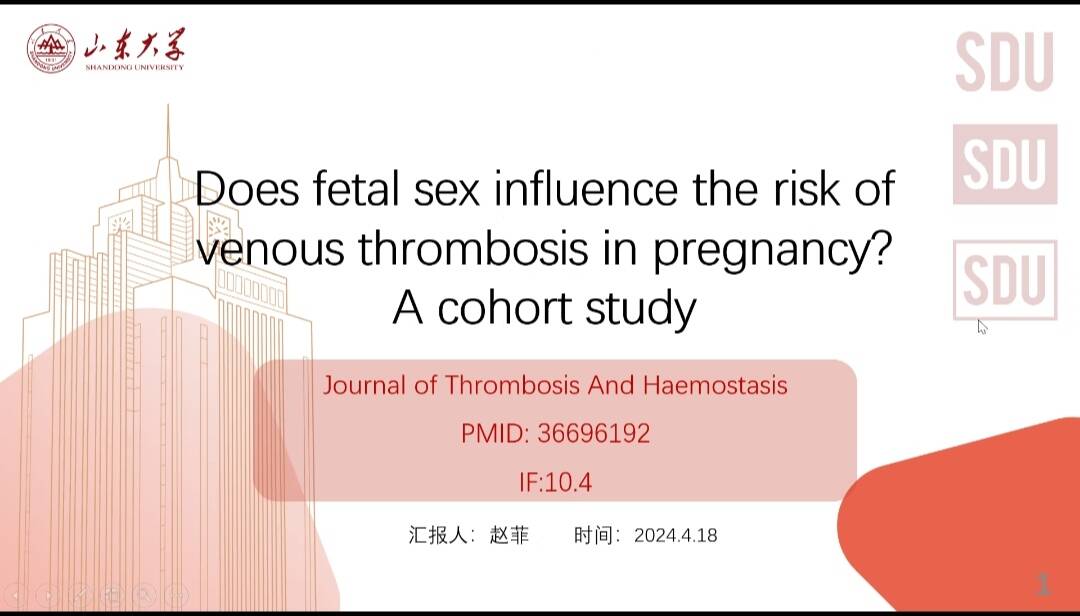 第四位汇报者是2022级硕士研究生赵菲,汇报的文章来自于Journal of Thrombosis And Haemostasis期刊,题目为“Does fetal sex influence the risk of venous thrombosis in pregnancy? A cohort study”。 众所周知,炎症是静脉血栓栓塞的危险因素,并且多项研究发现,与怀有女性胎儿的孕妇相比,怀有男性胎儿的孕妇的炎症水平更高。因此该研究调查了与胎儿性别相关的妊娠相关静脉血栓栓塞的风险。这项队列研究将来自国家登记处的数据联系起来,比较了怀有男性胎儿孕妇和怀有女性胎儿孕妇在孕期及产后3个月发生静脉血栓形成事件的发生率和风险比。使用1995年至2017年的全国数据。所有年龄在15岁至49岁之间、有活产或死产的丹麦女性都有资格入选;最终包括137万名研究对象。怀孕前患有静脉血栓、缺血性心脏病、脑血管疾病、血栓形成倾向或癌症的女性被排除在外。研究结果显示,怀有男性胎儿的孕妇其静脉血栓形成的发生率为每10,000次妊娠发生8.0次,而怀有女性胎儿的孕妇为6.8次。怀有男性胎儿的孕妇在妊娠期间静脉血栓形成的调整后风险比为1.2(95% CI,1.1-1.4),而产后为0.9(95% CI,0.7-1.0)。妊娠第30周之前,静脉血栓栓塞的风险才会升高,“滑动窗”分析显示,妊娠第25周左右风险比值出现最高。这些发现表明,怀有男性胎儿的孕妇在妊娠期间发生静脉血栓的风险略高于怀女性胎儿的孕妇。产后胎儿性别的不同并未增加静脉血栓栓塞的风险。分享该研究的原因如下:一是大型队列研究的结果较为可靠;二是随着我国高龄、肥胖等孕产妇妊娠比例增加,静脉血栓栓塞引起孕产妇死亡的比例逐渐增高,但是其发病机制尚未明确。本研究提供了静脉血栓栓塞有关性别的机制探索;三是本研究使用“滑动窗”的方法进一步分析了在不同孕周和静脉血栓栓塞发生的关联。