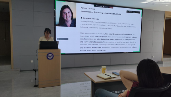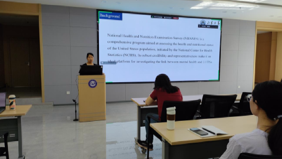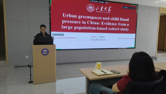 第四位汇报者是2022级硕士研究生彭馨宁,汇报的文章来自Environmental Research期刊,题目为“Urban greenspaces and child blood pressure in China: Evidence from a large population-based cohort study”。这项研究基于我国的一项大规模人群队列研究——广州儿童生长环境、生活方式、身体和心理健康发展项目的基线和三年随访,旨在分析城市绿地与儿童血压之间的关系,以及空气污染、体力活动和体重指数在其中的中介作用。这项研究的亮点之一是使用多种方法扩充了分析数据,并不局限于队列研究中的数据。例如城市绿地通过哥白尼哨兵二号卫星和地理信息系统获得;儿童相关资料通过电子健康记录系统和教育记录系统获得;儿童父母相关资料通过儿童父母填写的电子调查问卷获得;空气污染通过随机森林模型获得。最终研究结果显示,城市绿地对儿童的血压,尤其是对来自较低社会经济地位家庭的儿童的血压,具有保护作用,并且能够降低他们发生高血压的风险;空气污染仅仅在学校绿地与儿童血压之间发挥中介作用,体力活动和体重指数主要在家庭绿地与儿童血压之间发挥中介作用。