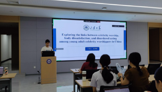 第一位汇报者是2022级硕士研究生赵建鑫,汇报的文章来自Body Image期刊,题为“Exploring the links between celebrity worship,body dissatisfaction, and disordered eating among young adult celebrity worshippers in China”。本文主要是在中国年轻成年名人崇拜者人群中,探讨名人崇拜与身体形象不满和饮食失调之间的关系,并分析身体形象不灵活性与身体形象不满在名人崇拜与饮食失调之间的中介作用。本研究共招募了593名参与者,分性别对所有研究假设进行验证。最后结果发现名人崇拜与瘦弱倾向的身体形象不满无关,与强健倾向的身体形象不满有关。身体形象不灵活性与强健倾向的身体形象不满在名人崇拜与饮食失调之间起到中介作用。通过本篇文章我们大致可以了解到中国年轻名人崇拜者的名人崇拜水平现状,及其与饮食和身体形象困扰之间的关联。随着我国物质与精神文明的不断发展,名人崇拜现象越来越普遍,本研究为在中国视角下干预名人崇拜相关饮食与身体形象困扰问题提供了一定参考。