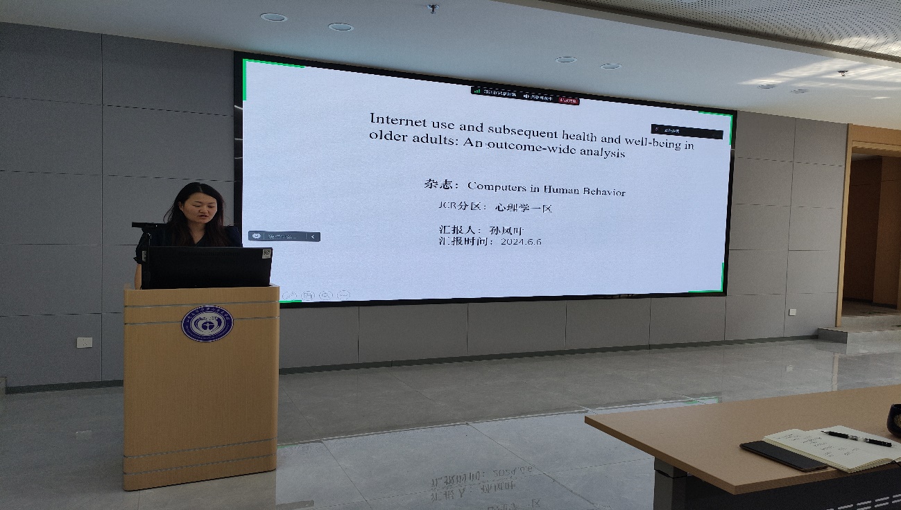 第三位汇报者是2022级硕士研究生孙凤叶,汇报的文章来自于Computers in Human Behavior期刊,题为“Internet use and subsequent health and well-being in older adults: An outcome-wide analysis”。研究发现,互联网使用与老年人健康和幸福感之间的关系结果喜忧参半。以前的研究大多在同一时间点只研究一个或几个结局指标,因此在因果推论方面存在不足。本研究通过对日本老年人样本的纵向分析,探讨了互联网使用与广泛健康和幸福感结局之间的关系。数据来源于日本老年学评估研究(JAGES)和全国长期护理保险(LTCI)数据库。研究纳入了六个维度的健康和幸福感指标,包括身体/认知健康、心理困扰、主观幸福感、社会幸福感、亲社会/利他行为和健康行为,共细分为34个具体的结局指标。采用回归模型逐一分析了互联网使用与34个结局指标的关系。研究得出了四个主要发现。首先,几乎每天使用互联网与社会福祉的几个结果有关,例如更频繁地参加体育团体、更频繁地与朋友见面以及一个月内见到的朋友数量更多。其次,几乎每天使用互联网和每月使用互联网几次,与更好的日常生活活动能力(IADL)相关。第三,几乎每天使用互联网的人比那些不使用互联网的人更有可能进行健康检查。第四,几乎没有或不太有力的证据表明,互联网使用与随后的其他健康和福祉指标有显著关联。这些发现为理解互联网使用对老年人健康和幸福感的影响提供了新的视角,也为未来相关政策和干预措施的制定提供了参考依据。