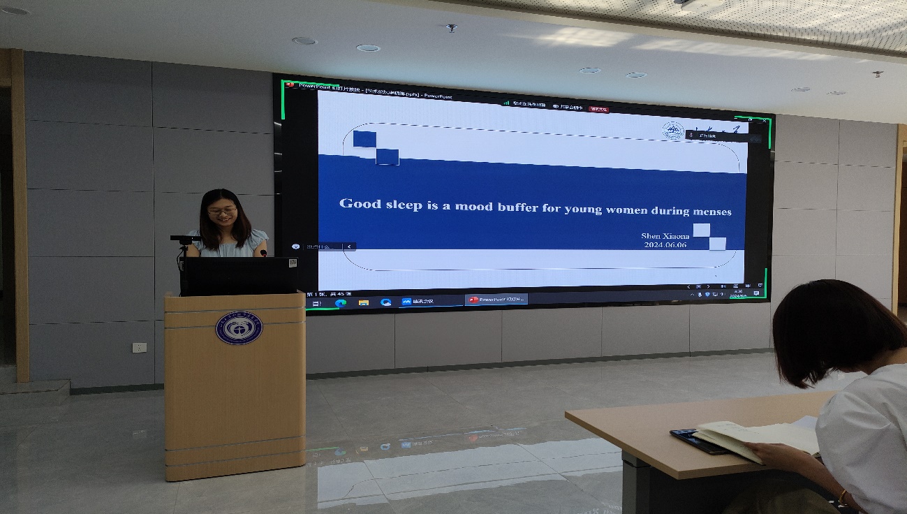 第一位汇报者是2022级硕士研究生申晓娜,汇报的文章来自于Sleep期刊,题为“Good sleep is a mood buffer for young women during menses”。在研究情绪与月经周期之间关系时,相关研究表明,个体在经前和月经期间的情绪更差。事实上,多项研究发现,女性在月经前3天及月经期内的情绪显著恶化。睡眠是探讨月经周期相关情绪变化时应考虑的重要因素。研究发现,年轻女性在月经周期中的自我报告睡眠质量存在显著差异,即使没有月经相关症状的女性,在经前和月经期间的睡眠质量也较差。然而,大多数通过可穿戴设备客观测量睡眠效率的研究表明,健康年轻人在月经周期内的睡眠没有变化。因此,本研究结合主观和客观测量方法,在2个月内每日收集睡眠、情绪和月经状况数据。通过时滞互相关模型和混合线性模型分析了睡眠与情绪关系的显著性和方向性,以及月经周期状态和睡眠之间的交互作用对情绪水平的影响。结果显示,月经状况本身并不直接影响情绪,但主观睡眠质量和月经状况的交互作用对积极情绪产生了显著影响。良好的主观睡眠质量感知可以作为情绪缓冲器,在整个月经周期内为积极情绪提供保护。