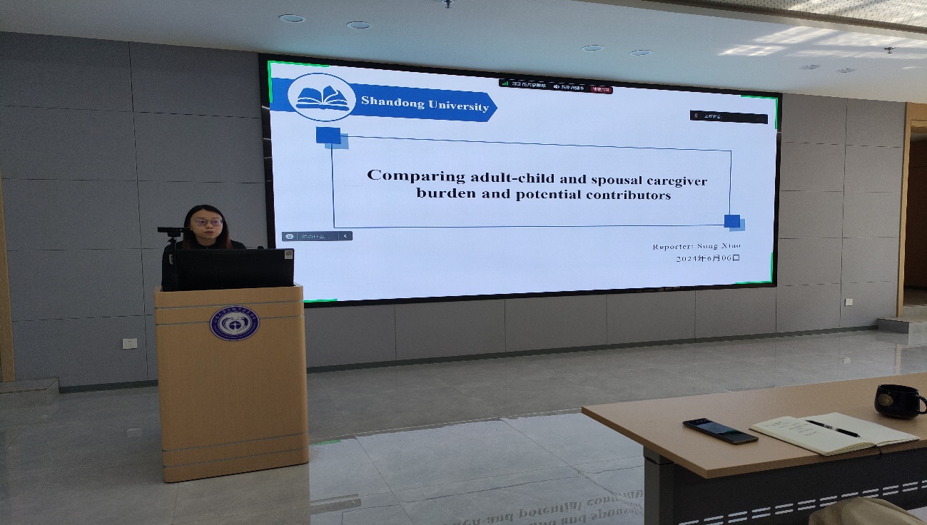 第二位汇报者是2022级硕士研究生宋逍,汇报的文章来自于cancer期刊,题为“Comparing adult-child and spousal caregiver burden and potential contributors”。该研究探讨了成年子女照顾者和配偶照顾者在负担水平上的差异及其潜在因素。相关研究表明,尽管成年子女照顾者在照护上花费的时间较短,他们报告的照顾负担水平更高。因此,本研究借鉴压力来源模型,纳入六项可能的中介变量,旨在探讨照顾者与患者关系及照顾负担差异的内在机制。研究采用结构方程模型分析了两类照顾者群体在照顾负担水平上的潜在中介因素。结果显示,是否工作、照顾者与患者的性别一致性以及照护前准备是影响照护者社会情绪负担差异的中介因素,而经济负担差异则没有发现显著的中介因素。通过这些分析,本研究揭示了不同类型照顾者在照顾负担方面的差异,并为进一步理解和减轻照顾者负担提供了理论依据。