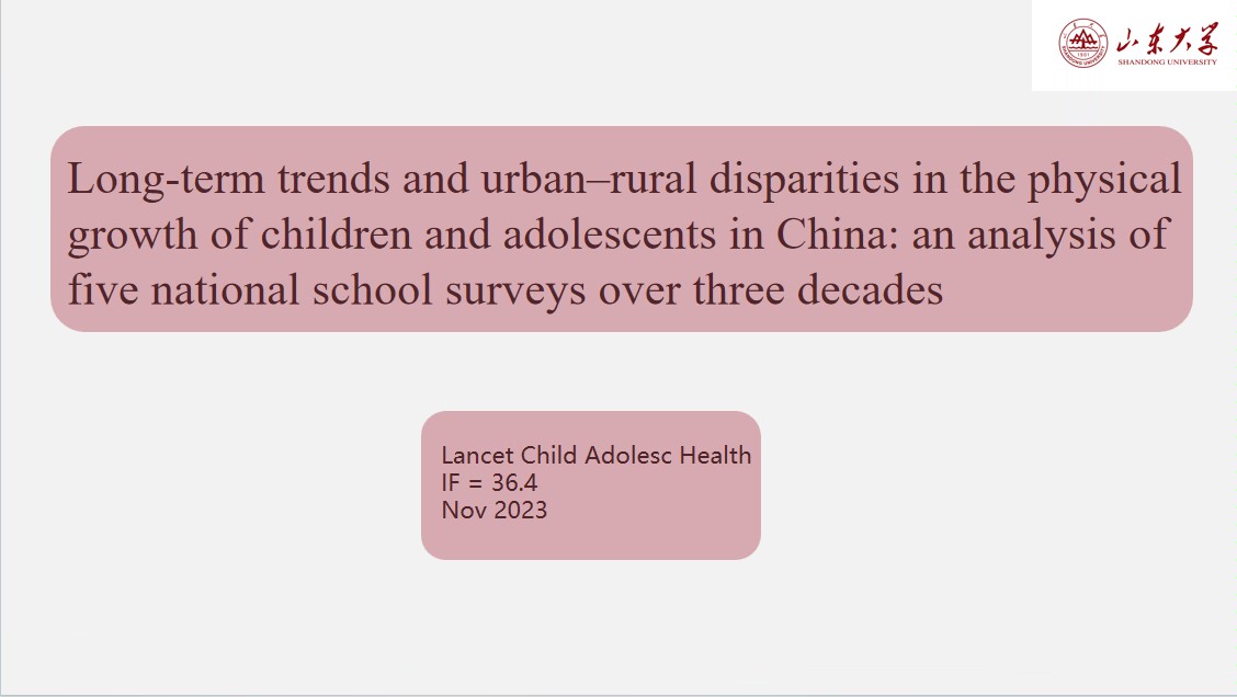 第四位汇报者是2022级硕士研究生赵佳,她汇报的文章发表在Lancet Child & Adolescent Health期刊,题为“Long-term trends and urban–rural disparities in the physical growth of children and adolescents in China: an analysis of five national school surveys over three decades”。本研究使用了1985年、1995年、2005年、2014年和2019年中国全国学生体质健康调查数据(CNSSCH),涵盖了中国大陆30个省、自治区和直辖市,分析了汉族7岁、12岁和18岁儿童和青少年的身高和BMI数据。所有调查均采用多阶段分层随机整群抽样方法,具有全国代表性。研究表明,在过去三十年中,中国学龄儿童的身高和BMI有所增加,同时城乡差异有所缩小。研究强调,需要加大投资,改善农村地区儿童获得健康食品的机会,帮助他们达到潜在的最高身高,这对未来的健康和人力资本至关重要。同时,需要制定策略控制儿童和青少年超重和肥胖的增加,这些策略应根据城乡具体情况进行调整,因为不同地区在饮食负担能力和多样性以及体育活动机会方面存在差异。