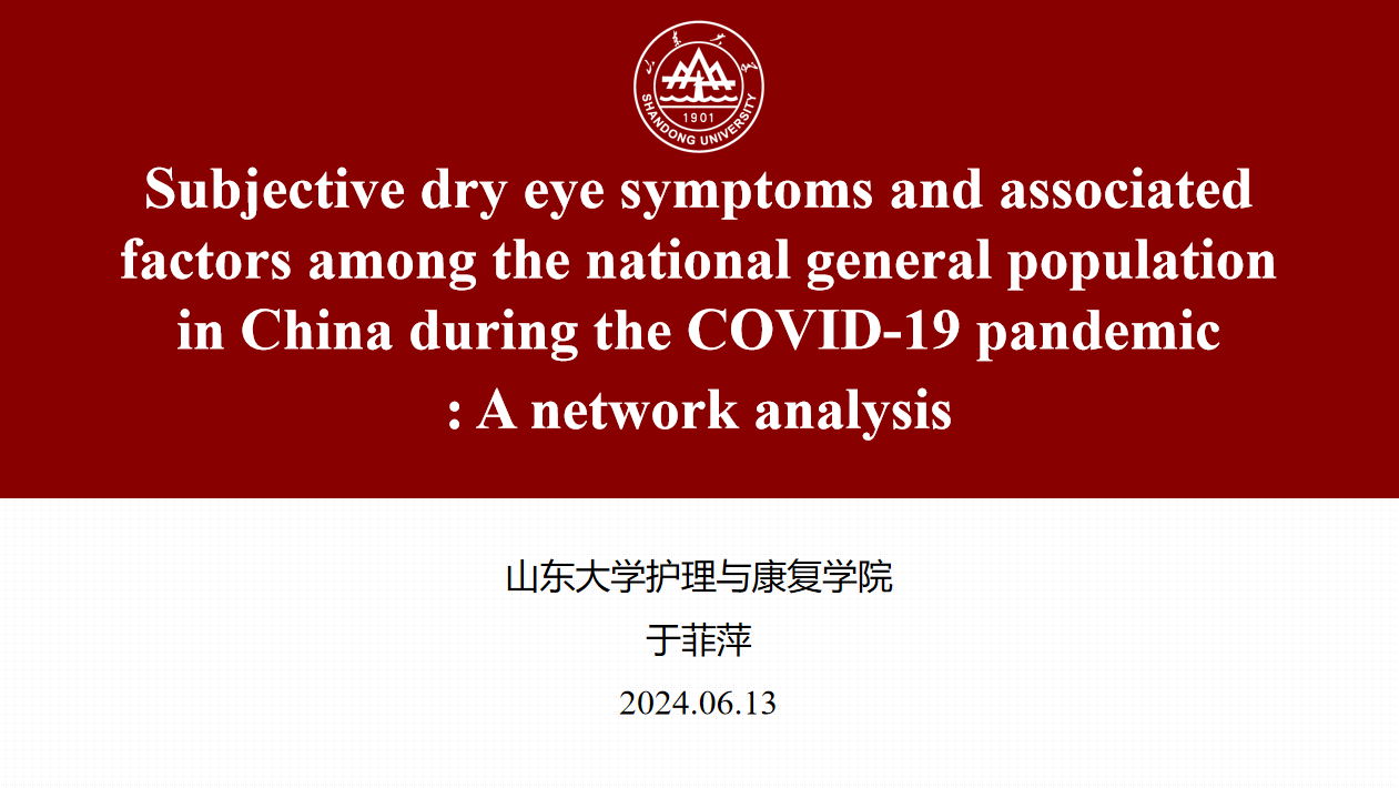 第二位汇报者是2022级硕士研究生于菲萍,她汇报的文章发表在Journal of Global Health期刊,题为“Subjective dry eye symptoms and associated factors among the national general population in China during the COVID-19 pandemic: A network analysis”。研究在COVID-19大流行背景下,采用社会生态学框架,通过网络分析探讨中国普通人群主观干眼症状及其影响因素。本研究共纳入了21916名研究对象,覆盖全国23个省、5个自治区和4个直辖市,占全国人口的94.12%,包括148个城市、202个区县、309个乡镇街道和780个社区/村。所有研究对象完成了自主设计的一般资料调查表和眼表疾病量表、大五人格问卷、PHQ-9、GAD-7、健康素养量表简表、三项孤独量表、互联网使用问题、家庭健康量表以及家庭沟通量表。研究将26个因素分别与社会生态学模型对应,并通过网络分析验证了结果的稳定性。这项研究在多层次社会生态模型框架内,确定了主观干眼症状与相关因素之间的关联。此外,研究发现抑郁症状在网络中表现出最高的节点强度,而眼表疾病指数(OSDI-6)问卷中的第四项在网络中也显示出最高的节点强度。这为长时间视觉活动在主观干眼症状的发展和加重中的作用提供了有价值的见解。