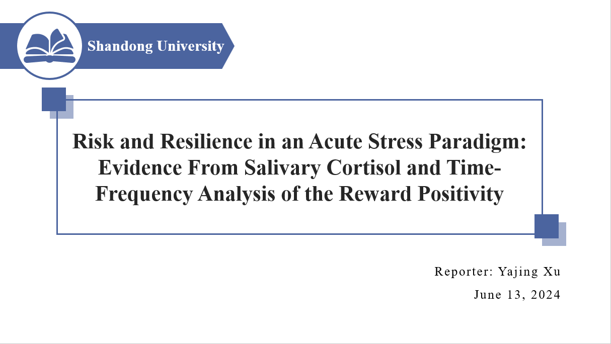 第一位汇报者是2022级硕士研究生许雅静,她汇报的文章发表在Clinical Psychological Science期刊,题为“Risk and Resilience in an Acute Stress Paradigm: Evidence From Salivary Cortisol and Time-Frequency Analysis of the Reward Positivity”。异常应激反应和奖赏反应与多种精神病理学形式密切相关,但对应激反应和奖赏敏感性之间关系的理解仍有限。本研究采用前-后测实验范式,探讨了下丘脑-垂体-肾上腺轴(HPA)应激反应与奖赏相关反馈敏感的事件相关电位(ERP)之间的关系。男性参与者在蒙特利尔成像压力任务前后完成一个简单的金钱奖励猜测任务,期间记录了他们的神经反应。结果显示,急性社会心理压力显著降低了神经系统对奖赏敏感的δ频段反馈的反应幅度,但对损失敏感的θ频段反馈影响不大。此外,基线时对奖赏的δ频段响应越强,预示着在压力条件下皮质醇的总体反应越小。这些发现表明,神经奖赏回路可能与压力相关的精神病理学的风险和复原力相关。本研究为我们提供了关于压力生理应激指标与神经奖赏反应之间双向关系的实验设计、数据分析及结果解读的启示,并为未来研究提供了宝贵的参考。