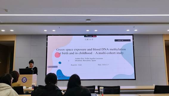 第三位汇报者是2023级硕士研究生李琪,汇报的文章题目是“Green space exposure and blood DNA methylation at birth and in childhood – A multi-cohort study”。2024年5月发表在JAMA Network Open期刊,影响因子为10.5分。该研究是一个基于七项多列研究的多队列研究,研究了绿色空间暴露和胎儿脐带血DNA甲基化和儿童期血液DNA甲基化的联系,拟合线性回归模型,同时考虑了多个协变量和混杂因素的影响,并进行了两项敏感性分析,没有统计学证据表明妊娠或累积暴露与任何妊娠相关(错误发现率,FDR,p < 0.05)。然而,周围的绿色暴露与ADAMTS 2、KCNQ 1DN、SLC 6A 12和SDK 1基因注释的四种DMR(三种在脐带血中,一种在儿童血中)呈负相关。本研究指出,这项研究虽然没有发现绿色空间暴露与血液DNA甲基化之间存在关联的证据,但是确定了周围的绿色暴露与四个DMR之间的关联,也为我们提出了绿色空间暴露和多队列研究的数据挖掘的关注点。