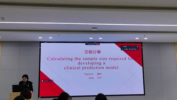 第一位汇报者是2023级硕士研究生姜晔,题目为“Calculating the sample size required for developing a clinical prediction model”,于2020年发表在BMJ期刊,影响因子为 93.6分。每年都有数以百计的预测模型发表在医学文献上,但许多模型开发的时候基于的数据集太小,特别是相对于目标人群总数或结果事件数而言。这就可能导致预测不准确,进而导致使用者做出错误的医疗决策。在预测模型样本量计算的时候,常用的经典方法如EPV原则,自变量数量的倍数等。然而,什么是模型开发所需的足够大的样本量并不明确,各种一刀切的“经验法则”被提出同时引起争议,这就给开发预测模型的研究如何进行样本量计算带来了困惑。Van Smeden和Riley等人就如何计算开发临床预测模型所需的样本量提供了指导,提出了临床预测模型计算样本量的4步法:确定需要多少样本才能准确估计平均风险(也就是平均概率,对应二分类或者生存数据)或者平均值(对应连续型数据);确定需要多少样本才能让模型的预测值和真实值之间的误差更小;确定有足够的样本量以防止过拟合;确定有足够的样本量使模型的表面性能和真实性能的误差更小。