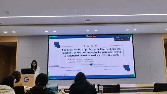 第四位汇报者是2023级硕士研究生林晓荷,她汇报文献的题目是“The relationship of problematic Facebook use and Facebook context on empathy for pain processing: A functional near-infrared spectroscopy study”,发表在《Computers in Human Behavior》期刊。本研究发现在问题性使用Facebook(PFU)的人和非问题性使用Facebook(非PFU)的人之间,前额叶皮层的活动存在显著差异。同时,研究也发现刺激显示的背景影响共情关系。对于非PFU组,Facebook背景下的痛苦刺激存在显著差异。另一方面,对于PFU组来说,报纸相关和中性背景分别对疼痛和非疼痛刺激具有显著差异。基于I-PACE模型,这些结果可以通过消极和积极情绪、情绪反应和注意力的影响来解释。更具体地说,PFU组可能倾向于分配更多的注意力到与Facebook相关的内容,接触与社交媒体相关的内容也可能引发他们自发的享乐反应。因此,本研究假定,在与Facebook相关的背景下,Facebook的布局元素可能会引起PFU患者的注意。因此,有问题的Facebook用户可能会忽略与疼痛相关的刺激。本研究的结果也对现实生活中在网络上引发疼痛共情的行为进行了反思。