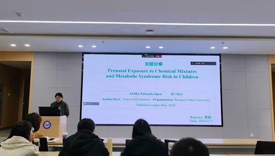 第二位汇报者是2023级硕士研究生李娇,汇报的文章题目为“Prenatal Exposure to Chemical Mixtures and Metabolic Syndrome Risk in Children”,于2024年的5月份发表于JAMA Network Open期刊,影响因子为10.5分。这项文章应用了由6项欧洲长期纵向研究组成的多中心队列数据,对1134名母亲及其6-11岁的孩子进行了调查研究,以评估产前暴露于9类内分泌干扰性化合物(EDC)与儿童代谢综合征(MetS)风险评分之间的关联,并确定了相关的蛋白质和代谢特征,以揭示潜在的机制和改变的代谢途径。结果表明产前暴露于EDCs混合物(尤其是金属、有机氯农药、多溴联苯醚和全氟化合物)可能与儿童期的不良代谢健康有关。这些发现拓宽了既往我们对EDC混合物在生命早期对代谢影响的有限认识,并为制定更有效的生命早期预防和干预策略提供了有用的信息,以应对整个生命过程中MetS发生发展不断上升的趋势。汇报者指出,这篇文章亮点在于对产前母体内EDC暴露水平进行了全面系统的且较为精准的测量;且针对各EDC类别的代谢特点选取最合适的生物标志物,可为我们未来研究中测定人体内特定EDC水平时选择最佳生物标志物提供参照;此外,共关注了9类EDC,在分别探索其与结局变量之间的关系及代谢产物和蛋白质之间的关联时,根据其生物学特性等对9类EDC进行再分类划分为几大类:金属及持久性有机污染物、非持久性污染物、亲脂性污染物等,丰富了研究结果。对于暴露变量、结局变量的处理都很全面而且多样化,为我们的研究设计提供启发。