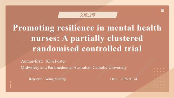 第三位汇报者是2023级硕士研究生王沐潼,汇报的文章题目为“Promoting resilience in mental health nurses: A partially clustered randomised controlled trial”,于2024年9月发表在《International Journal of Nursing Studies》期刊,影响因子为7.5。该研究采用部分整群随机对照试验设计在墨尔本一家大型三级公共精神卫生服务中心对精神健康护士展开心理弹性干预,分析心理弹性促进方案对精神健康护士应对自我效能(主要结局指标)、心理困扰、幸福感、心理弹性等(次要结局指标)的影响。该研究采用线性混合模型分析干预方案对护士的影响,结果表明,该方案在实施后及随访3个月内显著提升了精神健康护士的应对自我效能、心理弹性及创伤后成长,同时有效缓解了心理困扰并增强了幸福感。汇报者指出,该研究采用部分整群随机对照试验设计,结合了平行随机对照试验和整群设计随机对照试验的优点,允许只对干预组采用整群设计,为将来的干预研究提供有力参考。