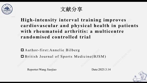 第二位汇报者是2023级硕士研究生王姣姣,汇报的文章题目为“High-intensity interval training improves cardiovascular and physical health in patients with rheumatoid arthritis: a multicentre randomised controlled trial”,于2024年12月发表在《British Journal of Sports Medicine》期刊,影响因子为11.8。该研究主要目的是评估高强度间歇训练和力量锻炼对类风湿性关节炎患者心肺健康的影响。次要目的包括评估研究对象的肌肉力量、人体测量指标、血脂水平、整体健康状况、患者总体印象评分以及疾病活动评分的变化。汇报者指出,该研究是一项评估员盲法、双臂、多中心的随机对照试验,客观测量了心肺健康相关指标,并请专业的研究团队根据患者的身体能力个性化的定制了合适的运动方案。此外,该研究还有一个优点是,将干预组与对照组中接受中等强度体力活动一般建议咨询且表现出最低水平积极影响的患者进行比较,进一步增强了研究的科学性和说服力。