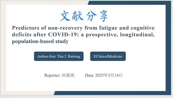 第一位汇报者是2023级硕士研究生田嘉琪,汇报的文章题目是“Predictors of non-recovery from fatigue and cognitive deficits after COVID-19: a prospective, longitudinal, population-based study”,于2024年3月发表在《EClinicalMedicine》期刊。这篇文献评估了3000多名患者在感染至少18个月的COVID - 19后疲劳和认知缺陷的长期轨迹。该研究假设在长期随访中有相当比例的患者会从这两种情况中恢复过来。最终发现,随访时持续疲劳的独立预测因子是抑郁症状和基线时的头痛,认知缺陷无法恢复的危险因素为年龄较大、男性、受教育年限不足12年。