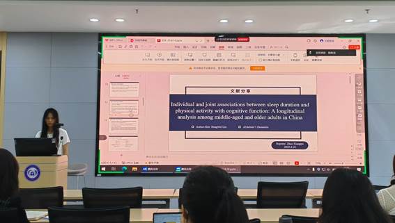第二位汇报者是2023级博士研究生赵香玉,汇报的文章题目是“Individual and joint associations between sleep duration and physical activity with cognitive function: A longitudinal analysis among middle-aged and older adults in China”,发表于“Alzheimer's & Dementia”期刊。该研究基于全球老龄化与成人健康研究-中国队列(SAGE-China),系统探讨了中国中老年人群夜晚睡眠时长和体力活动对认知功能的影响。研究共纳入14694名50岁及以上的研究对象,基于滞后模型运行了独立及联合效应两部分分析,以揭示夜晚睡眠时长和体力活动与认知功能之间的纵向独立和联合关联。独立效应分析发现,长期睡眠(>8小时/天)与认知功能下降显著相关,而短期睡眠(<6小时/天)和身体活动未显示独立关联。分层分析结果提示,随着体力活动的增加,长睡眠时长导致的认知损伤逐渐减轻。研究人员强调,针对睡眠干预需同步整合体力活动促进策略,特别是对长时间睡眠老年群体,实施“睡眠-运动”协同干预可使认知保护效益最大化。