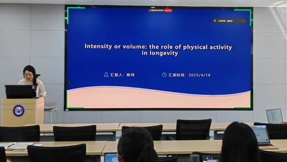 第四位汇报者是2023级博士研究生陈珂,汇报的文章题目是“Intensity or volume: the role of physical activity in longevity”,发表于“European Journal of Preventive Cardiology”期刊。该研究探讨了身体活动的体量、强度、持续时间与心血管疾病和全因死亡率风险之间的关联。分析基于2011至2014年美国国家健康与营养检查调查(NHANES)数据,结果显示身体活动的强度对降低死亡风险起关键作用,而不仅仅是活动的总量,此外,研究结果也显示进行5分钟的高强度活动对降低全因死亡率更有效,优于分散性的低强度活动。
