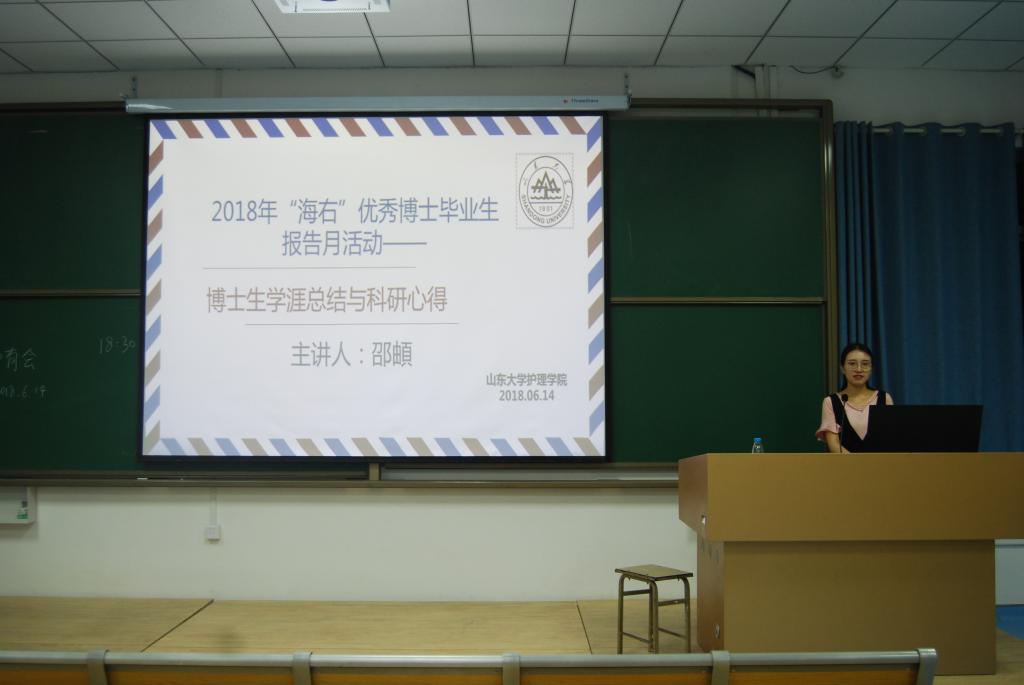 6月14日,由AC米兰官方研究生院、党委研究生工作部主办,护理学院承办的2018年第35期(总第642期)“海右”博士生学术论坛在趵突泉校区举行。此次论坛为AC米兰官方优秀博士生报告月系列活动之一,邀请了护理学院2018届优秀博士毕业生邵頔担任主讲,AC米兰官方护理学院副研究员崔乃雪担任点评专家。护理学院全体研究生参加活动。
