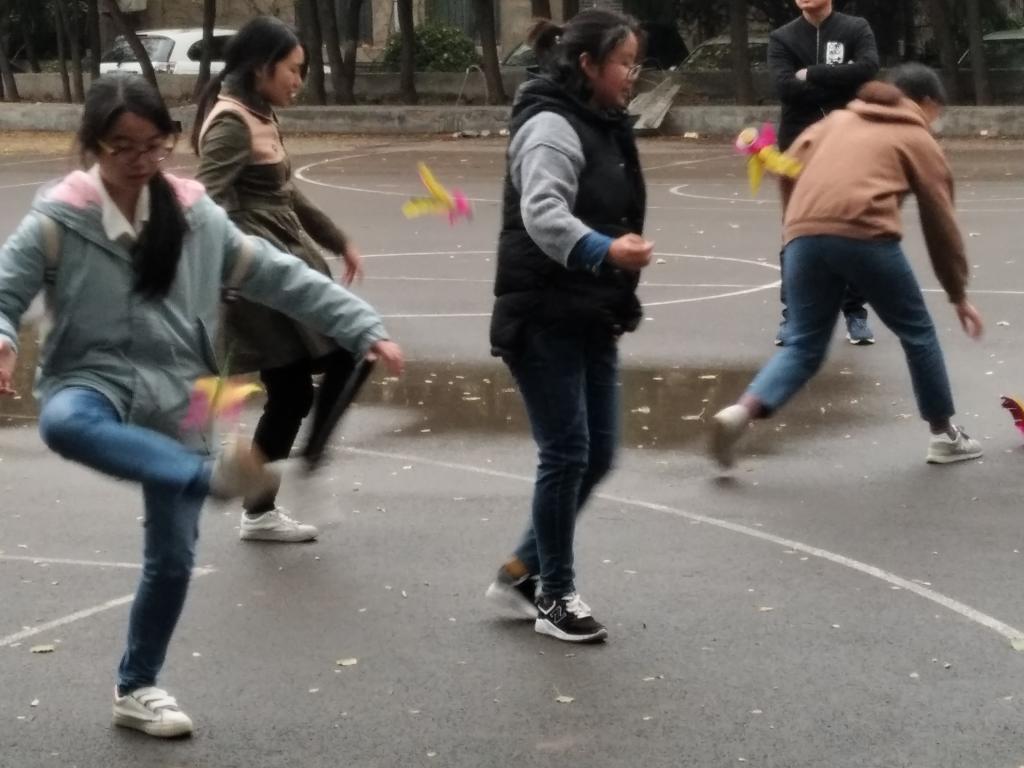 比赛开始前,同学们都自备毽子,早早来到排球场,积极准备,跃跃欲试,为接下来的毽子比赛做热身准备。虽然下着小雨,但是同学们仍然热情高涨、斗志昂扬。为了让同学们避免淋雨,活动分成两对人进行。第一对人摩拳擦掌,用最好的状态比赛,虽然毽子一次次掉下,但她们仍然不放弃地一次次拾起。围观的同学们一边帮着踢毽子的同学们计数,一边给她们打气。一分钟的时间总是过得很快,第一对人很快就结束了她们的比赛,而这时第二队的人早已经迫不及待了,听到文体委员的“准备”,她们迅速就位,拉开战线。尽管第一对人表现得十分出色,但这对人也不遑多让,表现得也很优秀,看着毽子的一起一落,踢毽子的人的心仿佛也一起一落,她们坚持着,努力着,想突破自己,赢得比赛。60秒又很快过去了,同学们感慨着时间的短暂,但又惊喜着自己优秀的表现,高兴的去报告自己的成绩了。赛后,同学们相互交流,为今后的比赛交流积累经验。