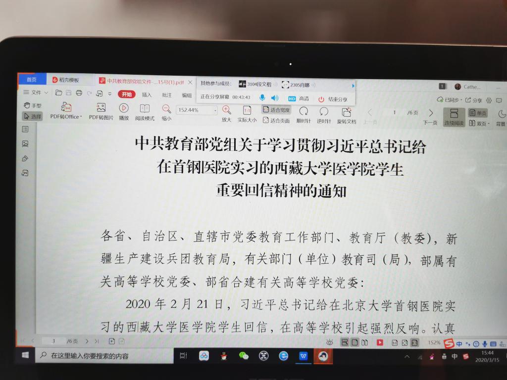 班会伊始,由寝室长和班委领读了《中共教育部党组关于学习习近平总书记给在首钢医院实习的西藏大学生医学院学生重要回信精神》的文件。领读后,由同学们表达对该文件的感想及感受,同学们表示,通过这份文件,可以看出习近平总书记对大学生的关心与希望,并表示,作为中国未来医疗事业的后备军,我们会认真学习,在实习期间认真学习思考,提升自身能力,为未来祖国的医疗事业添砖加瓦!班会最后,因正值开学季,同学们都迫切希望尽快开学,因此,由寝室长带头表诉了疫情以来,自己经历的事情及感想,以及对本寝室内的寝室成员的想念。