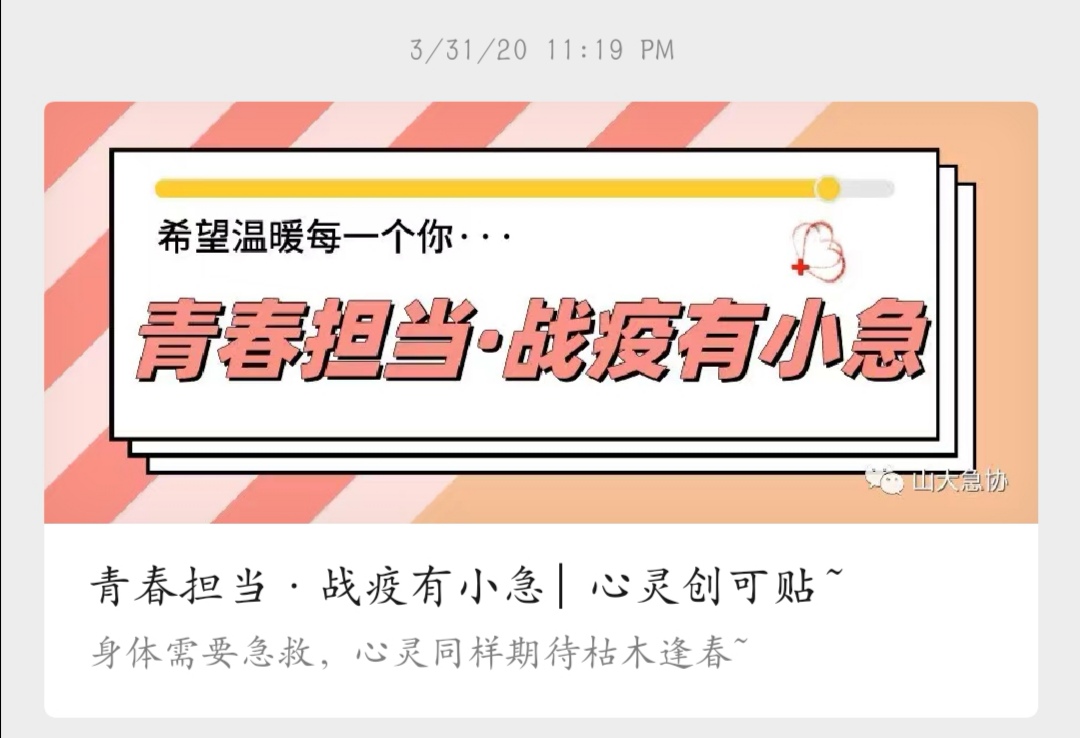 自校团委号召全体学生开展“青春担当,战疫有我”实践活动后,AC米兰官方急救协会积极响应号召,开展“青春担当,战疫有小急”系列志愿活动。依托微信公众号“山大急协”平台,积极搜集资料制作推文,宣传各类健康知识,为抗击新冠疫情贡献山大学子的绵薄之力。