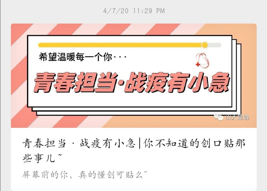 活动开始之初,便得到了来自协会成员的鼎力支持。大家踊跃报名,积极参与。截止目前,“山大急协”微信公众号共推出三篇推文。首期推文中,协会成员独具慧眼地提出了“心灵创可贴”的概念,将关注的重点落在了大学生的心理健康,通过回复同学的来信,号召大家热爱生活、做好自己。第二期推文中,协会成员为大家介绍了创可贴的有关知识,包括其历史、分类、正确用法以及可能产生的危害等内容,面面俱到,让人受益匪浅。而在最新推出的第三期推文中,协会成员关注了我们生活中极易被人忽视的盐,参考人民健康网、丁香医生公众号等专业知识,详细科普了过度食盐的危害、低钠盐的有关知识以及关于盐的小妙招,读来生动有趣、简单实用,极大地促进了同学们疫情期间居家的健康生活。