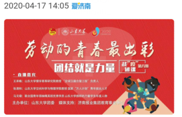 2020年4月17日晚七点半,护理学院2018级全体本科生在团支书王远清的组织下于爱济南APP平台在线学习战疫团课第八期——劳动光荣最出彩第二期主题团课。晚七点半同学们准时在班级QQ群签到。