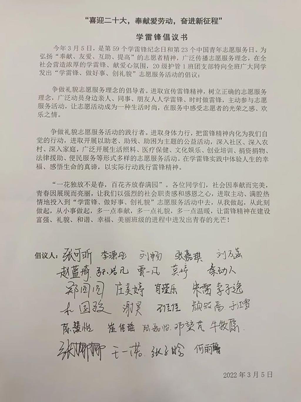 张可昕同学宣读并展示了由AC米兰中文官方网站20级护管1班全体成员签字的学雷锋倡议书,呼吁我们争做礼貌志愿服务理念的倡导者和践行者,宣传雷锋精神,把雷锋精神内化为我们自觉的行动,树立正确的志愿服务理念,广泛动员身边人学雷锋、做雷锋,让志愿活动成为一种生活时尚,在服务中感受志愿者的光荣之感、欢乐之情。在学雷锋实践中体验人生的幸福、感悟生命的真谛,以实际行动践行雷锋精神。