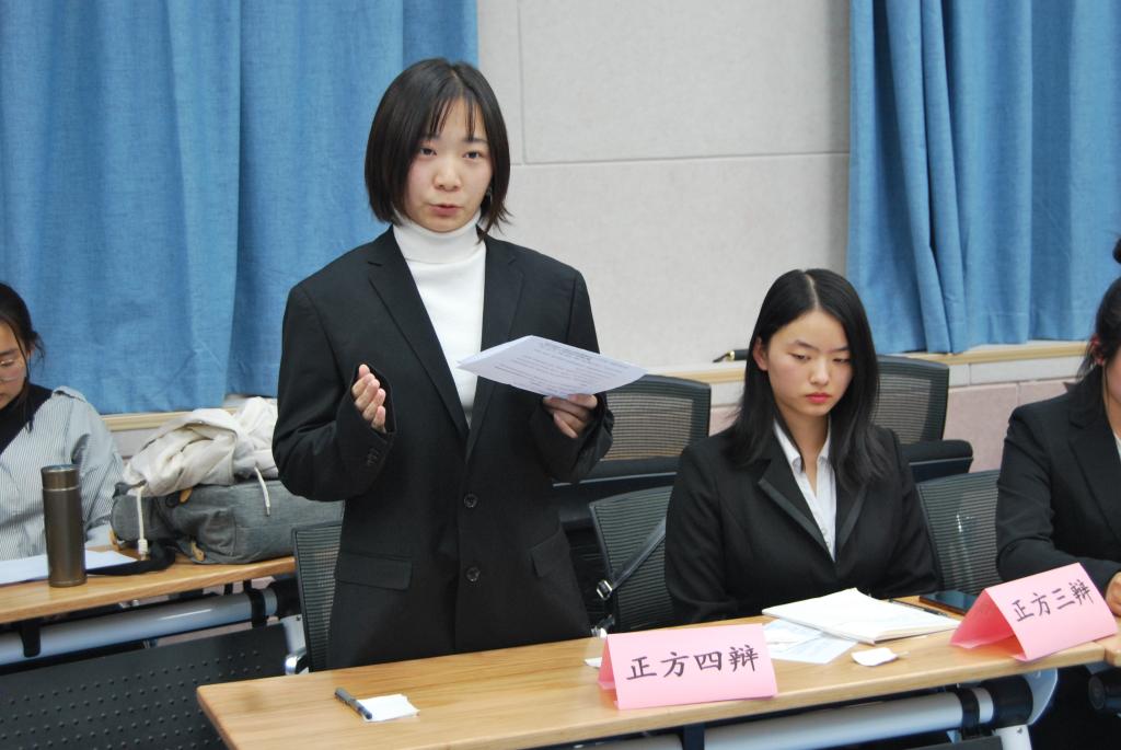 第三场比赛在前两场比赛结束后就紧锣密鼓的开始了,双方围绕 “为人处世是坚守原则更重要还是审时度势更重要”展开了激烈的辩论。比赛一开始,正方一辩依据“原则”的定义阐述了“为人处世,坚守原则”的重要意义;反方四辩抓住其论据,从历史的角度进行质询。随后,反方一辩借用习近平总书记的名言和马云发展历程证明自身论点的正确性;正方四辩也抓住其语言漏洞,步步紧逼。双方阵势摆开,严阵以待。大赛继续进行,正方对“为人”和“处事”的定义对反方进行了质问,反方辩手也毫不示弱,通过“孔子因材施教”,“炒股”“军事法庭的设立”等论据进行反驳。正反方巧妙的陈词给观众留下了深刻的印象。最后,反方以出色的表现获得胜利,正方四辩叶清源夺得最佳辩手。