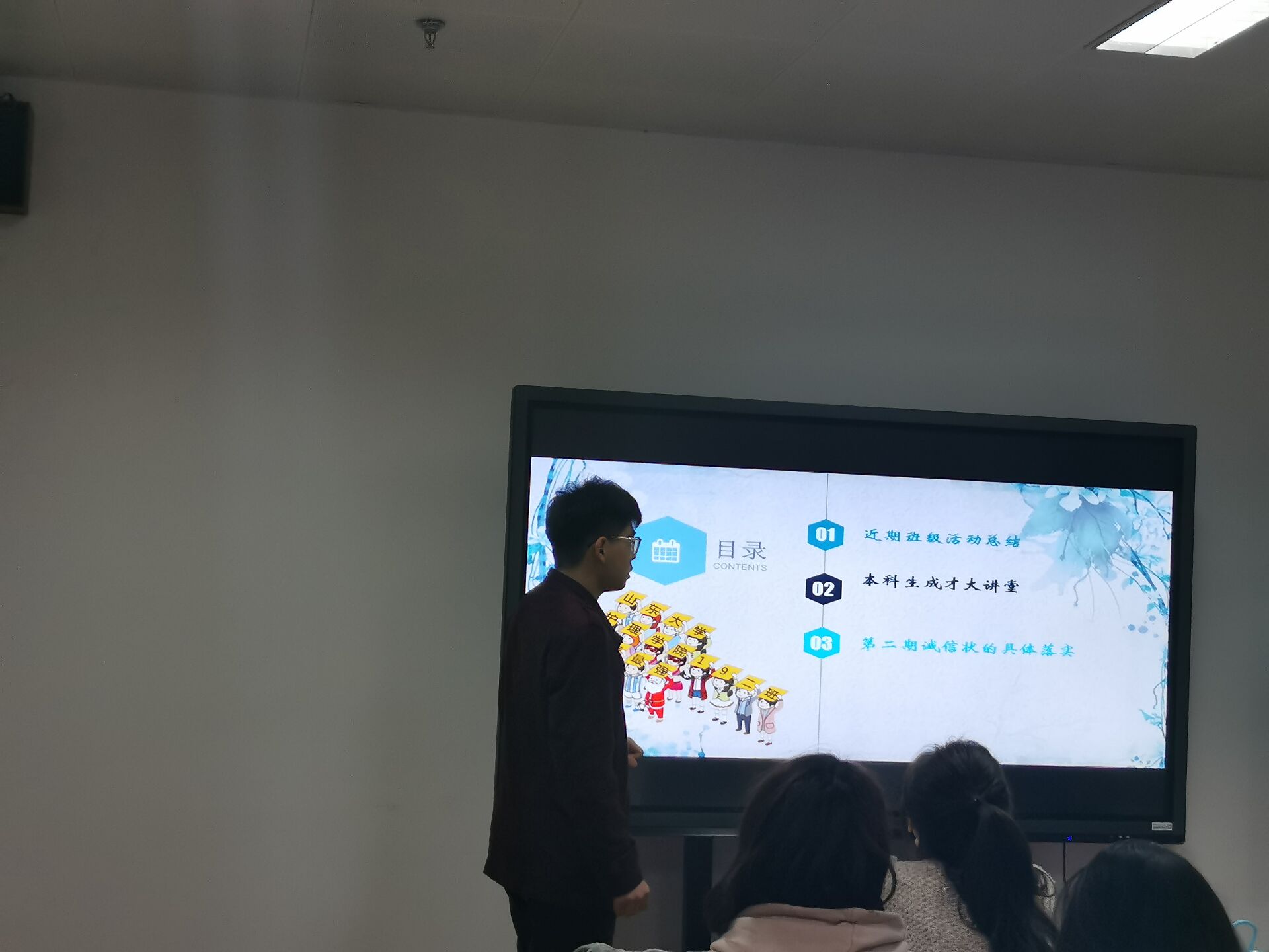 首先,护理二班班长胡章捷对本月所举行的济南动物园志愿者活动和消防志愿活动进行了整体的总结与概括,同学们在此次的志愿者活动中都有优异的表现,同时,班长也对本月学校举办的第一期诚信状打卡的活动进行了详细的总结,并如期开启了第二期诚信状打卡的活动。通过此次的班会的相关总结和安排,同学们都有意料之外的收获,无论是从连续20天的打卡,还是2天的志愿者活动,都从各方面体现出了同学们在大学生活的出色表现,同时,此次班会也请到了班主任王菊老师,向我们详细介绍了老师自己在大学求学时的经历和遇到的烦恼,为我们的大学规划打下了良好的基础。