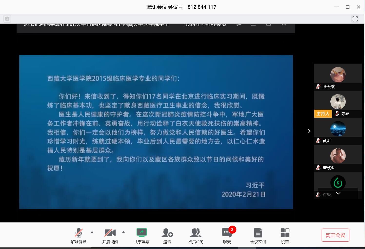 3月15日上午九点,由19级护理2班组成的参会人员均已到位。会议伊始,由班长胡章捷带领同学们对习近平总书记致西藏留首钢医院的17位青年学生的回信进行了解读,并提出要向那些西藏同胞们学习,要珍惜学习时光,将来要以仁心仁术造福广大人民、基层群众。