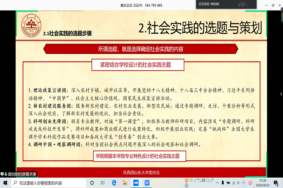 最后,高怡明同学根据自身的社会实践经历,向大家介绍了应该如何撰写社会实践白皮书,以及立项、结项的相关事情。高怡明同学通过向大家展示她自身参加的“天使在行动”支教团活动的立项、结项的PPT,来向同学们清楚地介绍了立项和结项,同时也鼓励同学们积极参加最终的评优活动。
