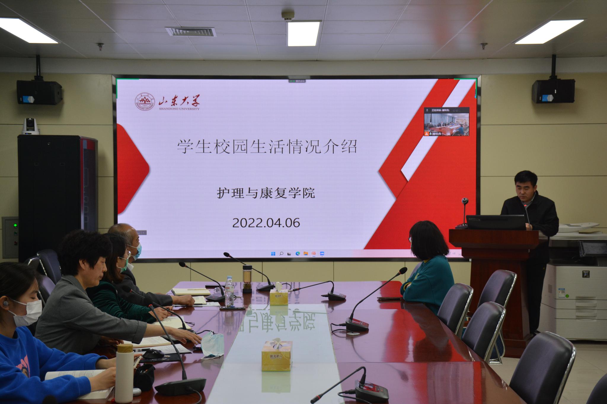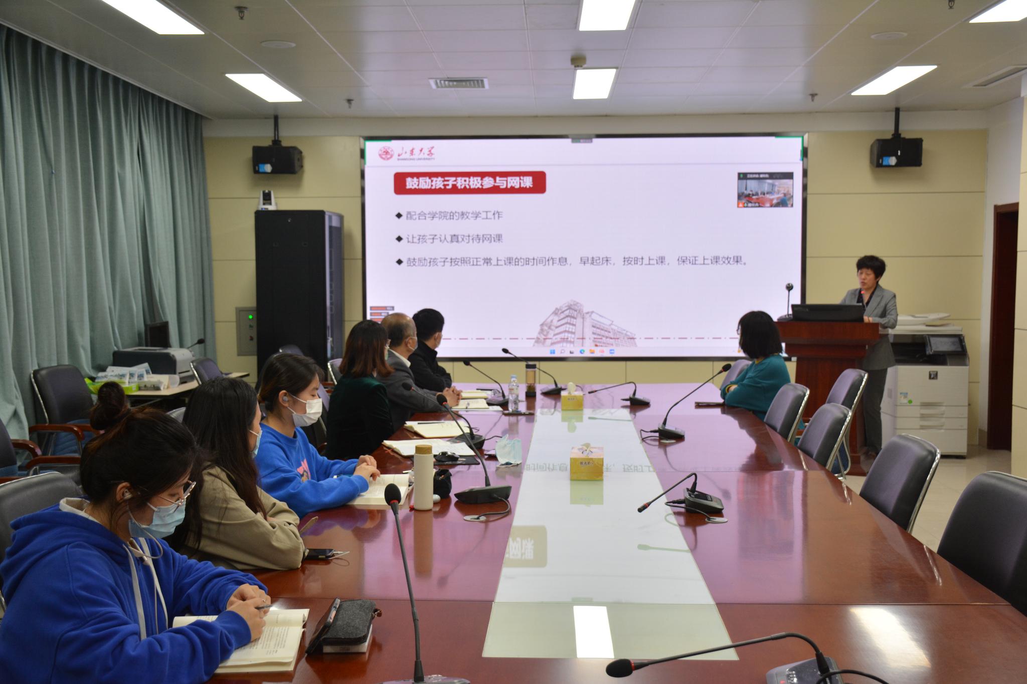 会议初始,王晓林代表学院衷心感谢各位家长参与。他结合山东省疫情防控要求和济南市属地管理要求,向家长们介绍了AC米兰官方的整体疫情防控情况。自3月30日起,学校启动应急防疫措施,开始进行封闭式管理全线上教学,最大程度的阻断病毒进入校园的途径。学院积极响应学校政策,全体领导班子、多位教师和全体辅导员留驻学校,尽己之力维护学生的学习生活如常和各项工作正常开展。接下来,分别由分管教学、学生工作的副院长、副书记介绍线上教学情况、学生在校生活学习情况等,并邀请学生代表就各自的生活学习、存在的困难、目前的状态等做了简要的分享。在线上教学方面,以“学生中心、成果导向和持续改进”为原则,学院第一时间通知课程负责人和教师并安排线上督导工作,积极收集教师与学生反应的问题并进行双向反馈,破除线上教学的每一项阻碍;在学生生活方面,全体辅导员24小时在岗,深入学生宿舍、网络课堂,始终与学生在一起,艾斌通过一组组实拍图片向家长展示同学们在学校充实快乐的生活和学习现状。同学们井然有序、有条不紊的保持着正常的学习和生活节奏,三天一次的核酸检测安全到位,种类齐全的生活物资充足实惠,线上线下的各类活动丰富多彩,留驻学校的老师导员暖心陪伴,更有热心奉献的志愿者同学担当作为、坚守岗位。通过来自中心校区、趵突泉校区和趵突泉西村公寓的三位学生代表的分享,让家长们更直观的了解了学生在校的真实情况和学校防疫工作的显著成效。