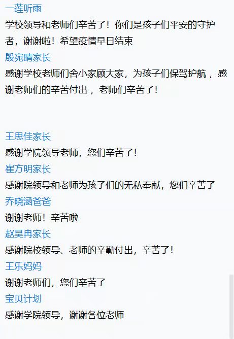 最后,王克芳院长在总结发言中提到,当今的疫情防控形势严峻,院校肩负的责任和使命义不容辞,我们一定会尽最大能力协助学生解决在此期间出现的各类问题。学院始终和学生在一起,希望家长们能安心、放心,也希望家长们能继续保持与学院的沟通协作,切实做好家院共建的桥梁,为学生的成长成才服务。家长们纷纷在评论区表示理解和支持,并且感谢学校和学院老师对于学生身心健康的全力维护和辛苦付出。