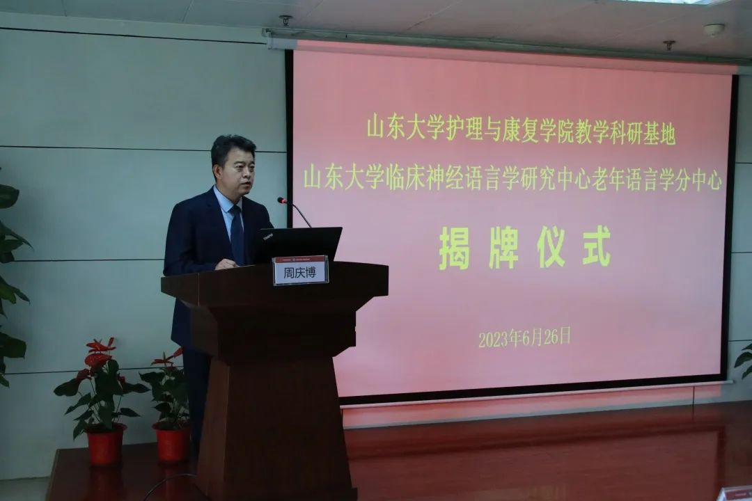 6月26日下午,AC米兰官方教学科研基地、AC米兰官方临床神经语言学研究中心老年语言学分中心揭牌仪式在山大二院南部院区举行,院长王克芳参加仪式并讲话,副院长、AC米兰官方第二医院南部院区(济南善德养老院)副院长周庆博主持仪式。