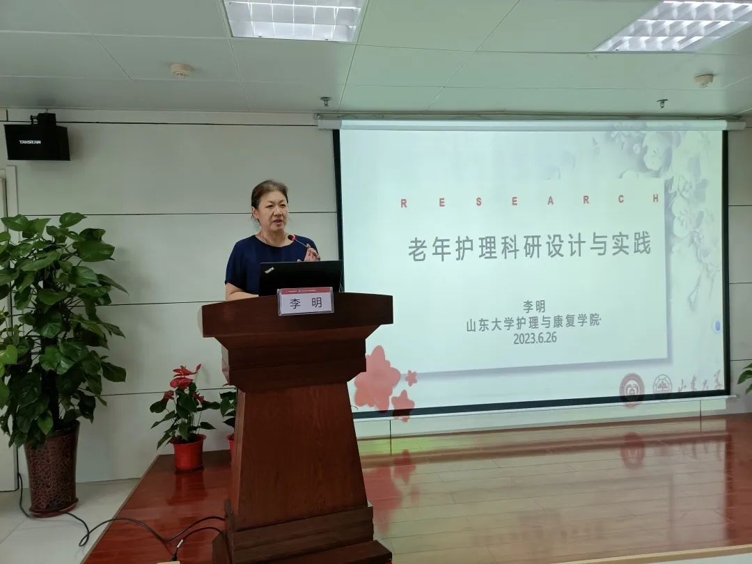 在专题讲座环节,学院基础护理学系主任李明教授带来题为《老年护理科研设计与实践》的报告,她结合自身研究实践从老年护理研究的选题与设计、课题或项目申报等方面进行了详细讲解。
