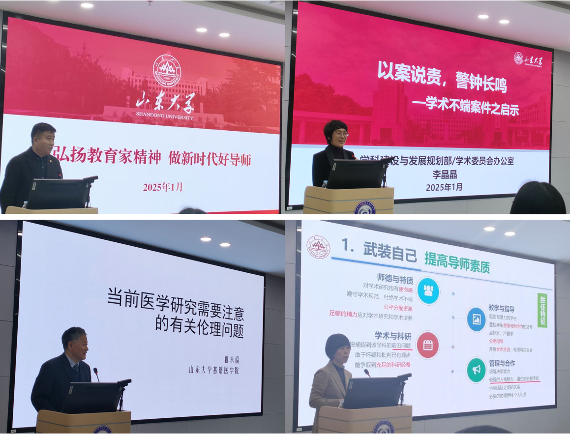 随后,会议正式进入了报告环节。张青以“大力弘扬教育家精神,争做新时代好导师”为题,结合自身丰富的教育工作经验,生动阐述了教育家精神的核心内涵,激励导师们积极争做新时代的楷模导师。李晶晶围绕“以案说责,警钟长鸣——学术诚信文件解读及案例分析”这一主题,通过具体案例深刻剖析了学术诚信的重要性,讲解了学校关于学术诚信的相关工作程序,提醒各位研究生导师务必恪守学术道德,严守学术底线,时刻铭记学术诚信的准则。曹永福则就“当前医学研究需要注意的有关伦理问题”进行了全面深入的讲解,他强调了医学研究中伦理规范的重要性,提醒导师们在科研工作中必须严格遵守伦理规范,确保研究的合规性。最后,曹枫林以“研究生教育中的导学关系”为主题,从师生双方的不同视角出发,深入剖析了优秀研究生的评价指标以及导学关系的当前状况。她分享了自己在导学关系中的宝贵经验和深刻体会,为导师们提供了有益的参考和启示。