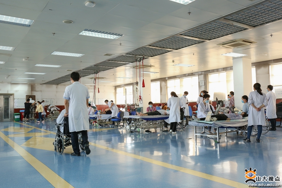 齐鲁医院康复中心病房位于东院区,走进宽敞明亮的康复大厅,里面摆放着先进的智能机器人和各种康复器械,不同于其他病区,患者们都在积极地“运动锻炼”,有的在家属的搀扶下行走,有的坐在轮椅上,有的躺在病床上,都在康复师的指导下,努力认真地进行着康复训练。